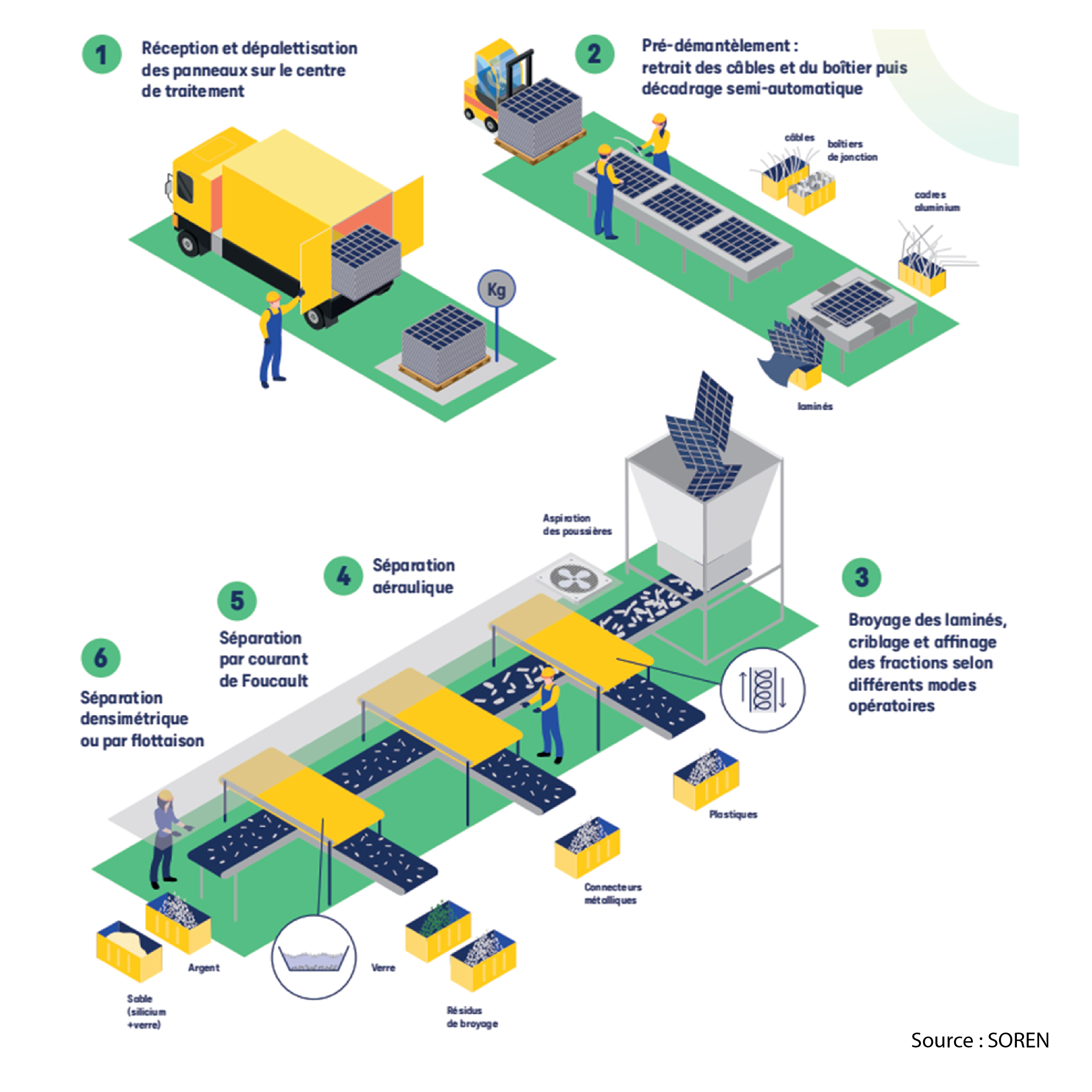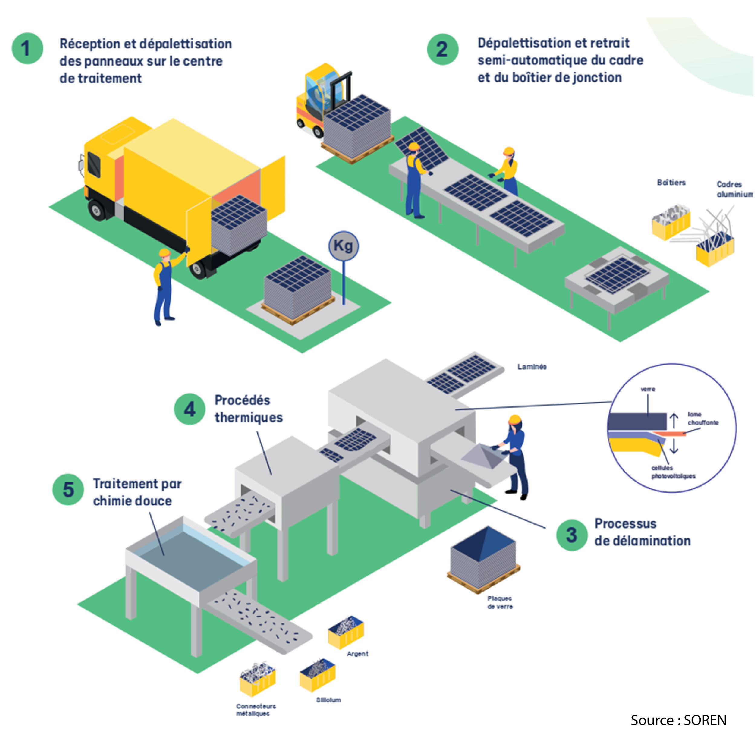 Le recyclage en fin de vie des panneaux photovoltaïques est devenu obligatoire en France depuis Août 2014. La refonte de la directive DEEE – 2002/96/CE a abouti à la publication d’une nouvelle version où les panneaux photovoltaïques en fin de vie sont désormais considérés comme des déchets d’équipements électriques et électroniques et entrent dans le processus de valorisation des DEEE.